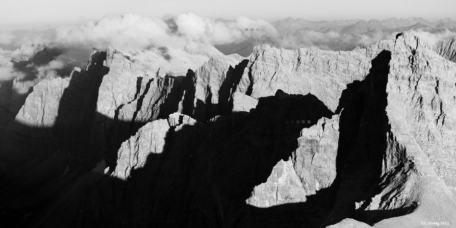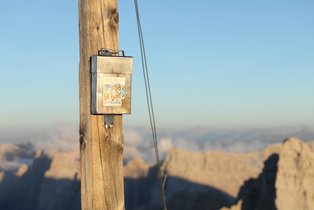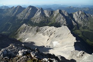 Das Gipfelpanorama ist spektulär. Hier sind wir im Herzen des Karwendels mit all seinen Kämmen und Karen. Man sieht fast jeden Karwendelgipfel und blickt auf den Alpenhauptkamm, die Bayerischen Voralpen und an Tagen mit bester Fernsicht bis zu den Dolomiten.