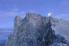 Rückweg: Hierfür bieten sich 2 Optionen an: Entweder auf dem gleichen Weg zurück oder aber am Fuße der Laliderer Wand (auf ca. 2400/2450 m) nach Osten queren und dann einem Weg bzw. Wegspuren, die von der Dreizinkenspitze herunterkommen, ins Roßloch folgen. Die zweite Option ist sicherlich interessanter, sollte aber auf keinen Fall bei Zeitnot, Wasserknappheit, wenig Sicht oder Gewittergefahr versucht werden, schließlich gilt es, weglos von der Biwakschachtel hinüber nach Osten zu queren. Diese Querung ist im Grunde nicht so schwer, aber man kann sich im Gewirr der Felsbrocken und etlicher Senken auch etwas versteigen: Man sollte daher Zeit- und Wasserreserven haben. Vorsicht auch mit Altschneefeldern! Im Bockkar gibt es über 10 Meter tiefe Trichter im Fels, so dass man immer einen Bogen um den Schnee machen sollte.