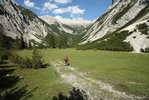 Ab Gleirschhöhe wird es noch gemütlicher: Wir lassen den Abzweig zur Pfeishütte rechts liegen, halten uns weiter nach Osten und rollen in sanften Kurven hinab zur Isar. Wir sind im Hinterautal, das sich tief zwischen der Karwendelhauptkette zu unserer Linken und der Gleirsch-Halltal-Kette zu unserer Rechten einschneidet. Steile Felswände begleiten uns: Beeindruckend sind vor allem die Gleirschwände und die steilen Nordwände an den Jägerkar- und Praxmarerkarspitzen. Hin und wieder lädt eine Bank zum Verweilen ein, doch wir haben noch einiges vor und heben uns die Pause an der Isar für unseren Rückweg auf. Wir passieren kleine Hütten, eine Stelle im Isarbett voller Steinmanderl und die Isarquellen. Etwa einen Kilometer später überqueren wir Geröllfelder und haben freien Blick auf die Birkkarspitze; an dieser Wegstelle zweigt der Adlerweg hinauf zum höchsten Karwendelgipfel ab. 500 Meter weiter liegt die Kastenalm. Nun gilt es aufzupassen, denn der Weiterweg ist nicht markiert. Wir zweigen nicht nach rechts zum Hallerangerhaus ab, sondern fahren links um die Kastenalm herum. Die nachfolgenden Bilder geben einen guten Eindruck des weiteren Wegverlaufs.