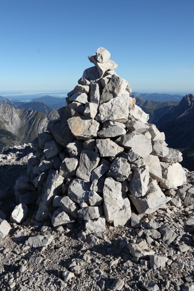 Gipfel: Wir stehen auf einem Gipfel ohne Kreuz, aber mit Steinmanderl und Seilwinde. Sie dient den Rettungsaktionen, die ab und an notwendig sind, wenn Kletterer an der Herzogkante oder in anderen Routen durch die Nordwand der Laliderer Spitze in Not kommen. Die Sicht ist einfach grandios. Wir blicken entlang der Karwendelhauptkette an den Sonnenspitzen vorbei zur Kaltwasserkar-, Birkkar- und zu den Ödkarspitzen. Wir sehen die Nördliche Karwendelkette ein und haben freien Blick auf die Bayerischen Voralpen. Im Süden breitet sich das Bockkar aus, eine riesige Geröllwüste: Auf nichts anderes als Fels und Stein trifft unser Blick, wenn wir Richtung Laliderer Wand, Dreizinkenspitze und Grubenkarspitze schauen. Im Süden grüßen Gletschergipfel aus den Zillertaler und Stubaier Alpen.