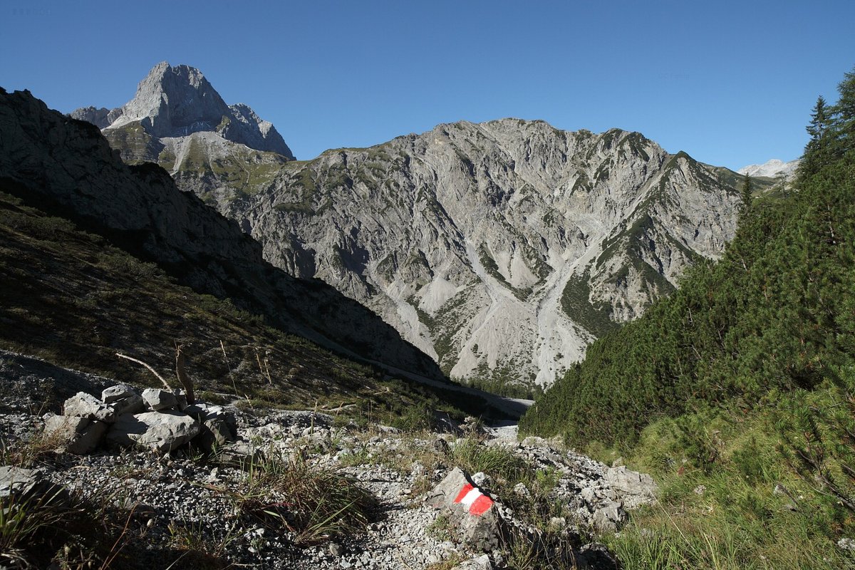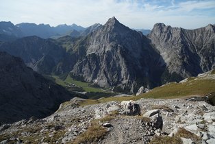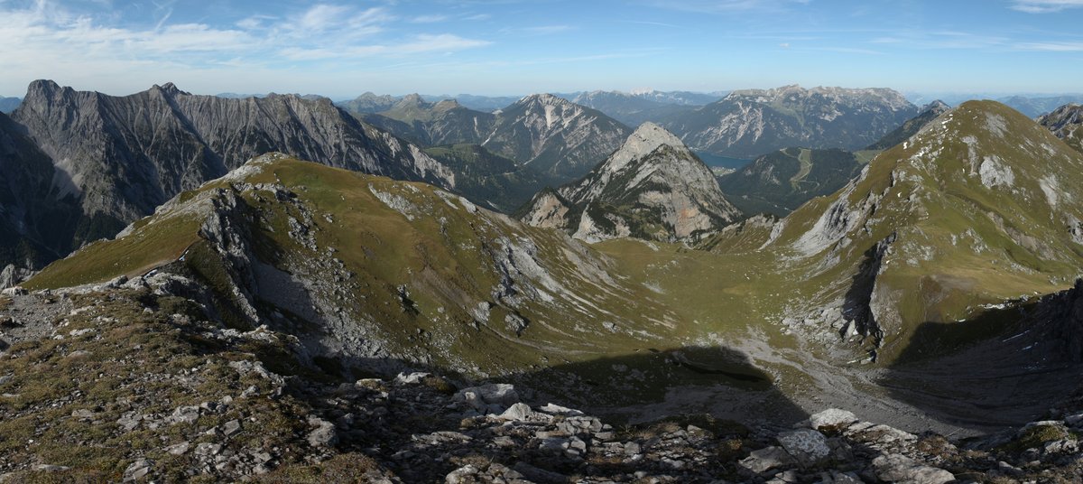 Das Gipfelpanorama ist sehr abwechslungsreich: Im Norden sieht man ins Vorkarwendel, im Nordosten breitet sich das Rofan aus, dazwischen spitzelt der Achensee hervor. Wunderschön ist die Fernsicht auf Watzmann, Hochkönig, Hohe Tauern und die Zillertaler bis zum Olperer, ehe das Karwendel den Blick versperrt. Wir sehen die Karwendelhauptkette entlang vom Hochnissl bis zur Birkkarspitze. Sehr nahe stehen Sonnjoch, Schaufel- und Bettlerkarspitze sowie das Falzthurnjoch.