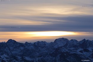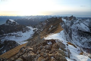 Gipfelpanorama: Die fantastische Rundumsicht sollte man länger genießen. Wir nehmen die imposanten Nordwände des Rofan wahr, der Blick wandert auf den Zireiner See, den Inn und hinüber zum Wilden Kaiser sowie auf die verschneiten und vergletscherten Gipfel der Hohen Tauern, Zillertaler und Stubaier Alpen. Im Westen liegt das Karwendelgebirge und in dieser Richtung erkennen wir auch die Erfurter Hütte und die Bergstation der Rofanseilbahn.