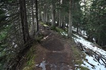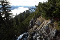 Wir erreichen nun den weiten Sattel zwischen Setzberg und der nördlich gelegenen Kuppe, auf der die Nebenkirche Wallberg Heilig Kreuz errichtet wurde. Der Schilderwald weist nun auch den Risserkogel aus. Mit 2 1/4 Stunden ist die Zeit sehr reichlich bemessen. Wir halten uns südlich in Richtung Setzberg, gehen am Wallberghaus vorbei und folgen am Fuß des Setzberges der Beschilderung, die uns nun ostseitig (links) um den Gipfel herumführt. Dabei wird südostseitig ein steiler Wiesenhang gequert, der bei Schnee auf Grund der Lawinengefahr mit großer Vorsicht zu genießen ist. Alternativ ist es in dieser Situation besser, den Setzberg zu überschreiten. Nach der Überschreitung oder Umgehung des Setzberg-Gipfels gelangen wir auf einen Waldpfad, der trotz seiner Nähe zu den ostseitigen Hängen unschwierig über Wurzeln an das Grubereck heranführt. Kurz vor dem Grubereck lassen wir den Wegabzweig nach Kreuth-Riedlern rechts liegen. In ein paar engen Kehren geht es zügig zum Grubereck hinauf, wo uns ein herrlicher Ausblick erwartet. Diese Aussicht wird uns nun bis zum Gipfel des Risserkogels begleiten. Meist geht es am Grat entlang. Ein gewisses Maß an Trittsicherheit ist von Vorteil, doch allzu ausgesetzt ist der Weg nicht. Zweimal weichen wir auf die Nordseite aus. Im Schlussaufschwung geht es eine Rinne hinauf und ein paar Meter weiter durchsteigen wir eine kurze Passage, die mit einem Drahtseil versehen ist, das aber nicht jeder benutzen wird. In den Latschen kann es im Sommer richtig heiß werden. Wenn der Wegabzweig nach Norden zum Blankenstein erreicht ist, sind es nur noch 5-10 min, bis wir den Endpunkt unserer Wanderung erreicht haben.