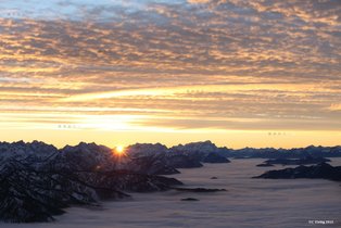 Gipfel: Der Risserkogel ist gut besucht. Wir werden in Gipfelnähe dennoch ein Plätzchen finden, um die großartige Aussicht zu genießen. Vom Watzmann bis zur Zugspitze bietet sich ein beeindruckendes Panorama. Unser Blick streift hinüber zu Großglockner und Großvenediger, auf die unzähligen Karwendelspitzen und über die vielen Bergrücken in Richtung Zugspitze.