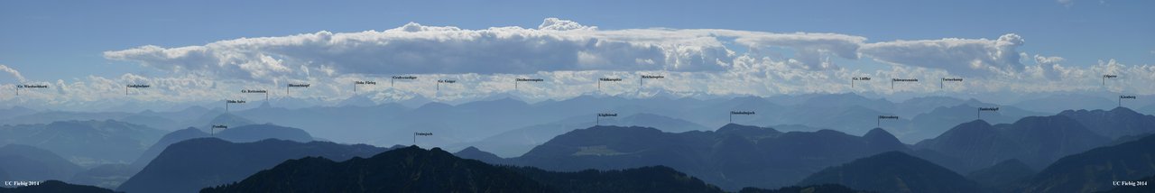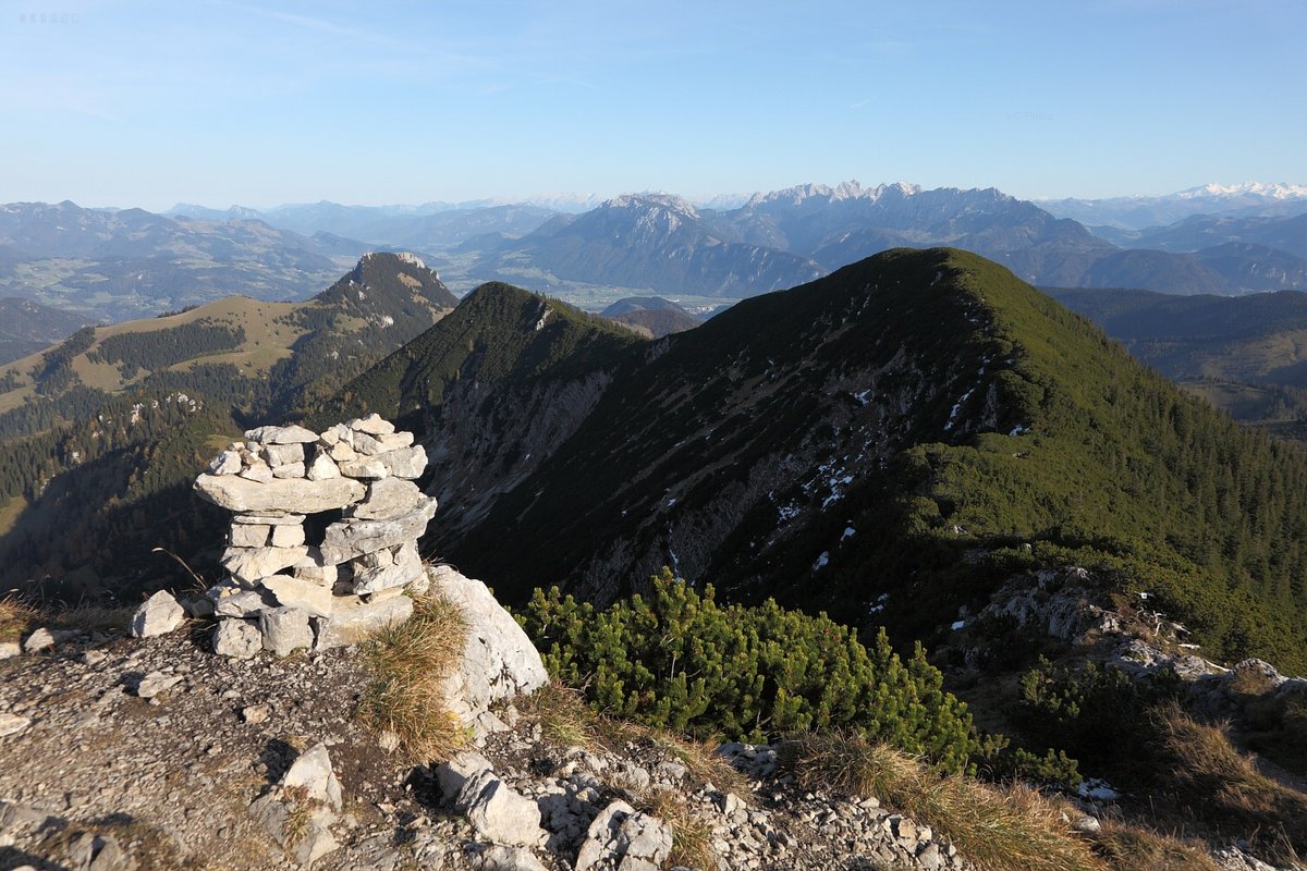 Gipfelpanorama: Die Gipfelpartie bietet Platz für etliche Besucher; bei großem Andrang wird es aber auch enger zugehen. Die Aussicht ist hervorragend! Im nordseitigen Aufstieg war uns der Blick nach Süden verwehrt, so dass wir erst mit der Ankunft am Gipfel bei guter Fernsicht den atemberaubenden Blick auf den Alpenhauptkamm genießen können: Kein einziger Berg nimmt uns dabei die Sicht: Vom Hohen Tenn in den Hohen Tauern bis zum Olperer in den Zillertaler Alpen reicht die Sicht. Die Schlierseer Berge liegen im Westen und die Wendelsteingruppe im Norden. Im Osten blicken wir bis zu Watzmann und Hochkönig.