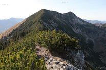 Abstieg: Unsere kleine Rundtour setzen wir nun in östlicher Richtung fort. Dabei folgen wir in etwa dem Gratverlauf hinüber zum Steilner Joch, befinden uns aber meist südlich etwas unterhalb des Grates. Unterwegs können wir weiterhin die Fernsicht genießen. Heiß kann es zwischen den Latschen werden, so dass man ausreichend Getränke mitnehmen sollte. Am Steilner Joch erwartet uns ein kleines Gipfelkreuz; hier steigen wir nun nach Norden etwas steiler ab und treffen bald wieder auf den Aufstiegsweg. Zur Rosengasse ist es nun nicht mehr weit.